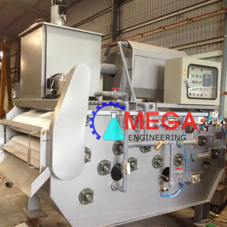 Máy ép bùng băng tải MEGA được thiết kế theo nguyên lý lọc ép liên tục bởi 2 băng tải đi qua hệ thống rulo theo qui trình như sau: bùn sau khi tạo bông được nạp vào máy qua vùng tách nước sơ bộ, sau đó vào vùng ép áp suất thấp, đến vùng vắt áp suất cao để làm giảm tối đa lượng nước có trong bã, kế đến là vùng cạo bã sau đó băng tải tiếp tụx đi qua vùng rửa băng tải và tiếp tục trở về vùng nạp liệu.Toàn bộ các quá trình được diễn ra liên tục và đồng thời với nhau.