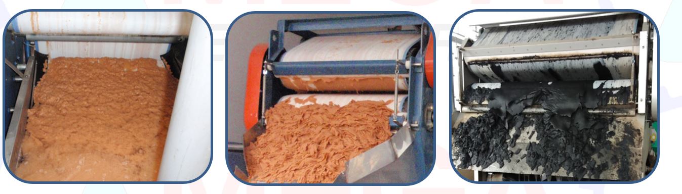 Máy ép bùng băng tải MEGA được thiết kế theo nguyên lý lọc ép liên tục bởi 2 băng tải đi qua hệ thống rulo theo qui trình như sau: bùn sau khi tạo bông được nạp vào máy qua vùng tách nước sơ bộ, sau đó vào vùng ép áp suất thấp, đến vùng vắt áp suất cao để làm giảm tối đa lượng nước có trong bã, kế đến là vùng cạo bã sau đó băng tải tiếp tụx đi qua vùng rửa băng tải và tiếp tục trở về vùng nạp liệu.Toàn bộ các quá trình được diễn ra liên tục và đồng thời với nhau.