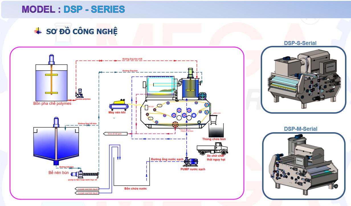 MEGA sản xuất hai dòng máy ép bùn băng tải chính : NSP-serial và DSP-Serial |