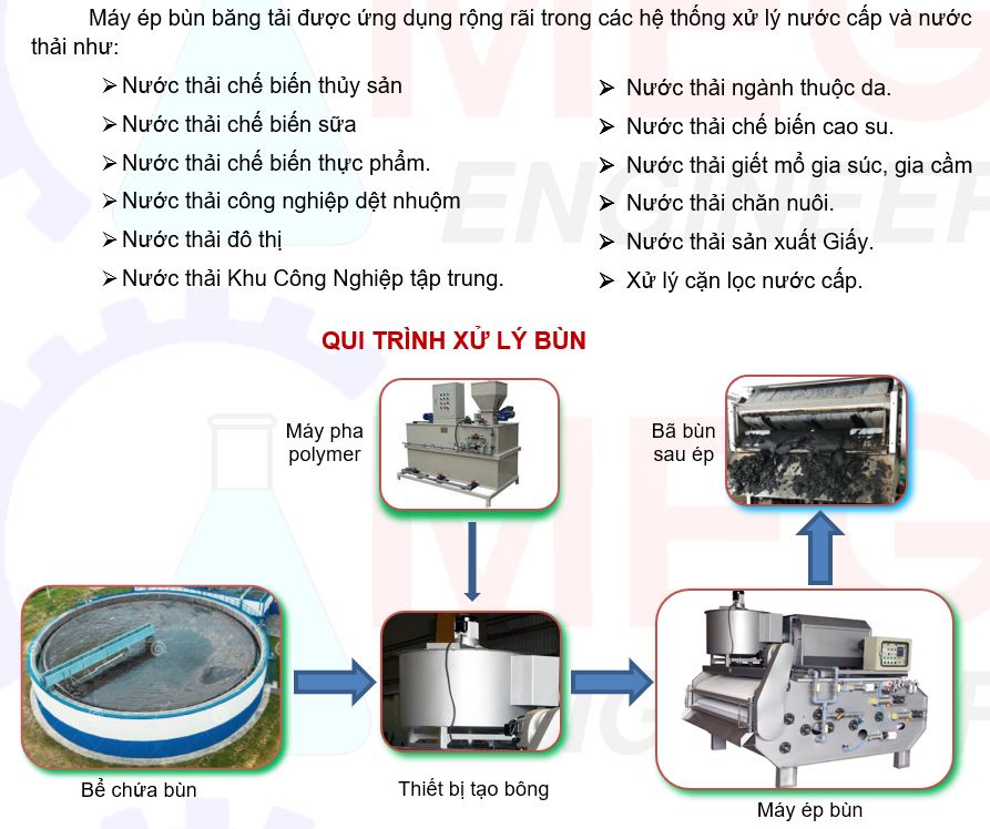Sau quá trình xử lý các chất ô nhiễm sẽ được tách ra khỏi nước thải dưới dạng cặn bã gọi là bùn thải, các lọai bùn này thường có hàm lượng cặn từ 1-5%, điều này có nghĩa là thể tích bùn rất lớn, làm tốn kém chi phí thu gom và phân hủy. Để giải quyết vấn đề trên thì máy ép bùn băng tải có chức năng làm đặc bùn đến mức tối đa, thể tích bùn có thể giảm đến 10 lần so với thể tích ban đầu của nó, tăng tính hiệu quả kinh tế và giảm thiểu ô nhiễm.