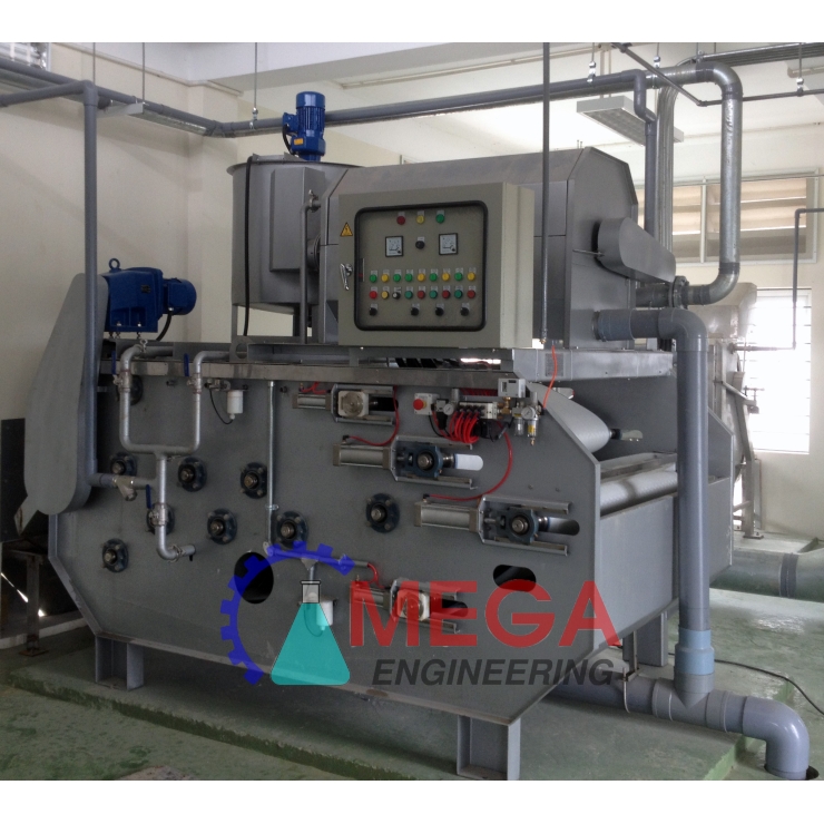 Máy ép bùng băng tải MEGA được thiết kế theo nguyên lý lọc ép liên tục bởi 2 băng tải đi qua hệ thống rulo theo qui trình như sau: bùn sau khi tạo bông được nạp vào máy qua vùng tách nước sơ bộ, sau đó vào vùng ép áp suất thấp, đến vùng vắt áp suất cao để làm giảm tối đa lượng nước có trong bã, kế đến là vùng cạo bã sau đó băng tải tiếp tụx đi qua vùng rửa băng tải và tiếp tục trở về vùng nạp liệu.Toàn bộ các quá trình được diễn ra liên tục và đồng thời với nhau.